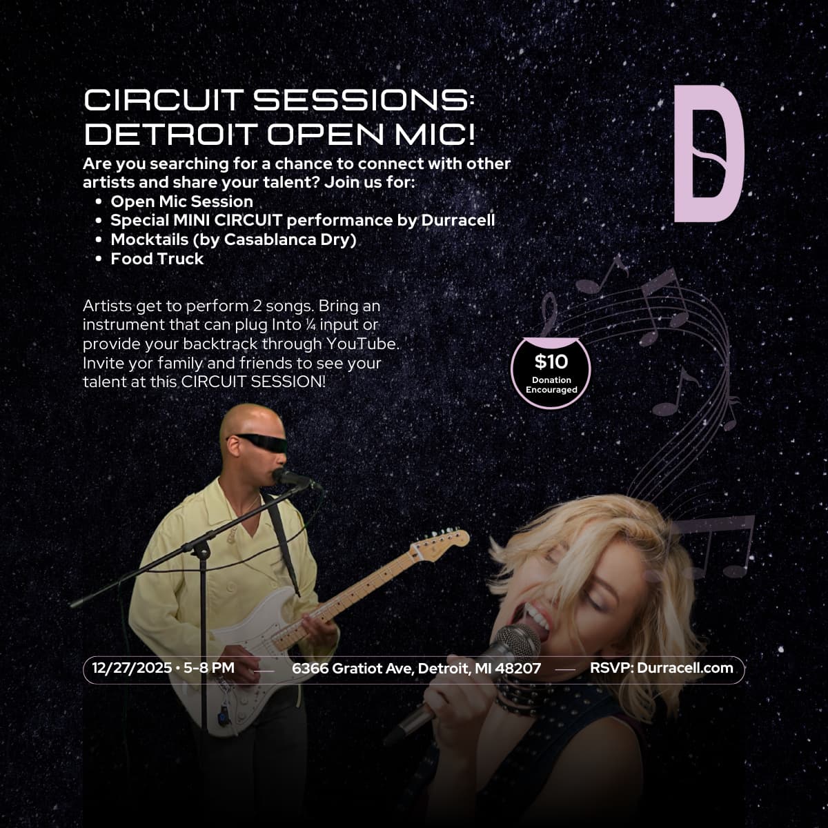 Join us for Circuit Sessions: Detroit Open Mic! on 12/27 β a night of community, creativity, and live music. Perform in the open mic, connect with local artists, enjoy mocktails by Casablanca Dry, and catch a special Mini Circuit performance by Durracell. All are welcome. Letβs build something electric together!